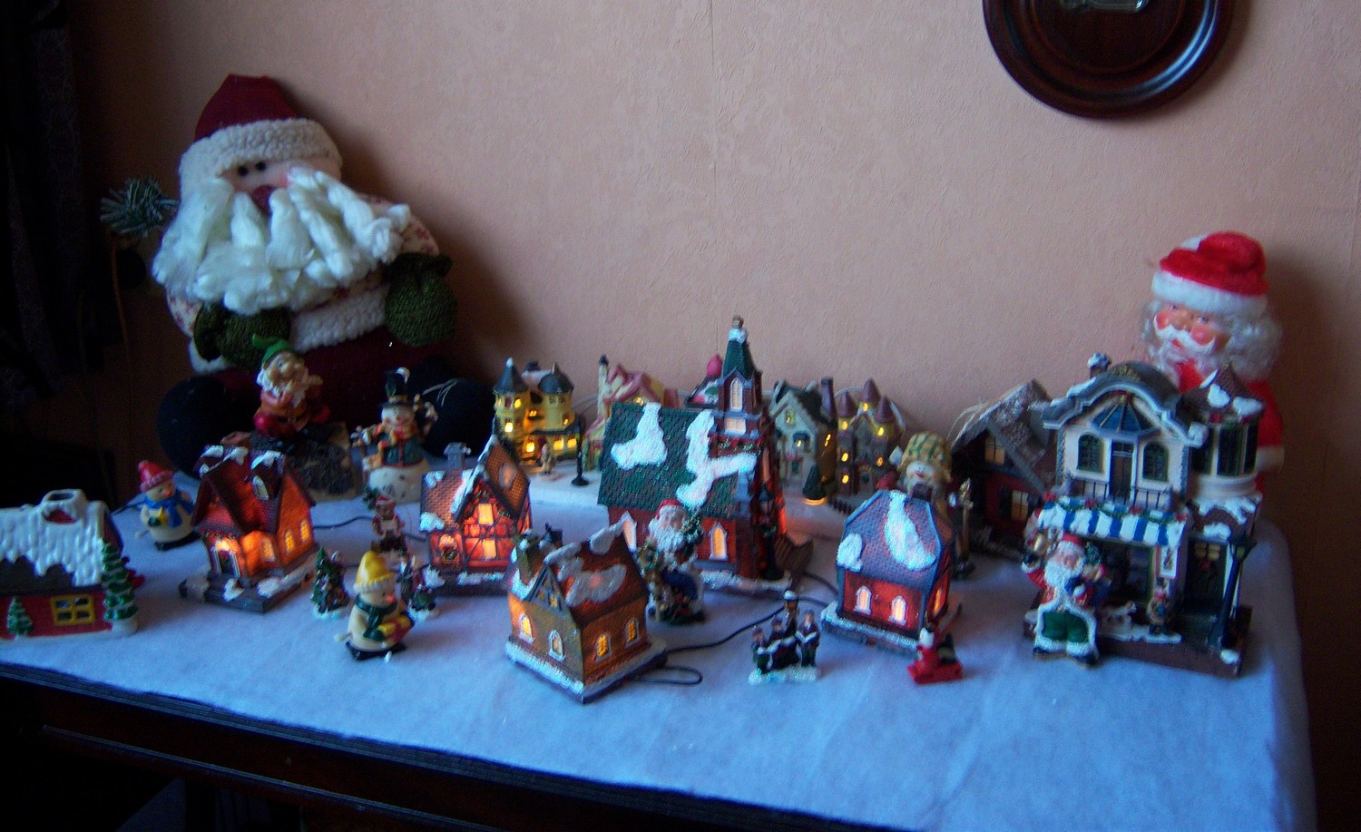 I've tried to make them without flash, but I had to make several ones, cause some of the pics I took were very blurry because of the without flash taking. Still they aren't brilliant as I said, but at least the lights are showing better. Don;t you love my bears with their bonnets? I do that every year, only the composition differs. And you see the little viallage Jan won in the lottery of the cafe, but it was a bit small, when I first put it up. Luckily I found some more houses in our boxes and with Santa added and some little figurines we also had lying around it is looking not too bad now. It's really a nice view in the evening when the lights are bruning in the houses.