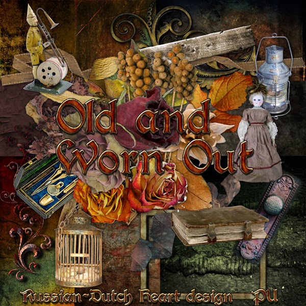 It's a kit in rather dark colors, grungy papers, and some great clusters from Arlene. Named it "Old and Worn Out""/